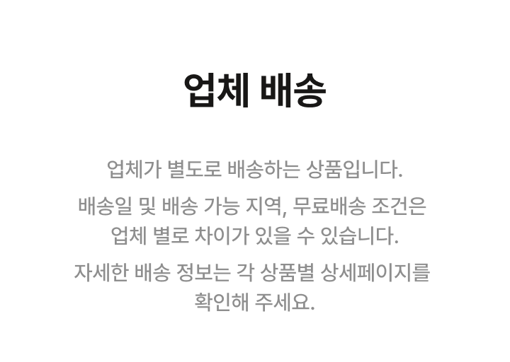 업체가 별도로 배송하는 상품입니다. 배송일 및 배송 가능 지역, 무료배송 조건은 업체 별로 차이가 있습니다. 자세한 배송 정보는 각 상품별 상세페이지를 확인해주세요.